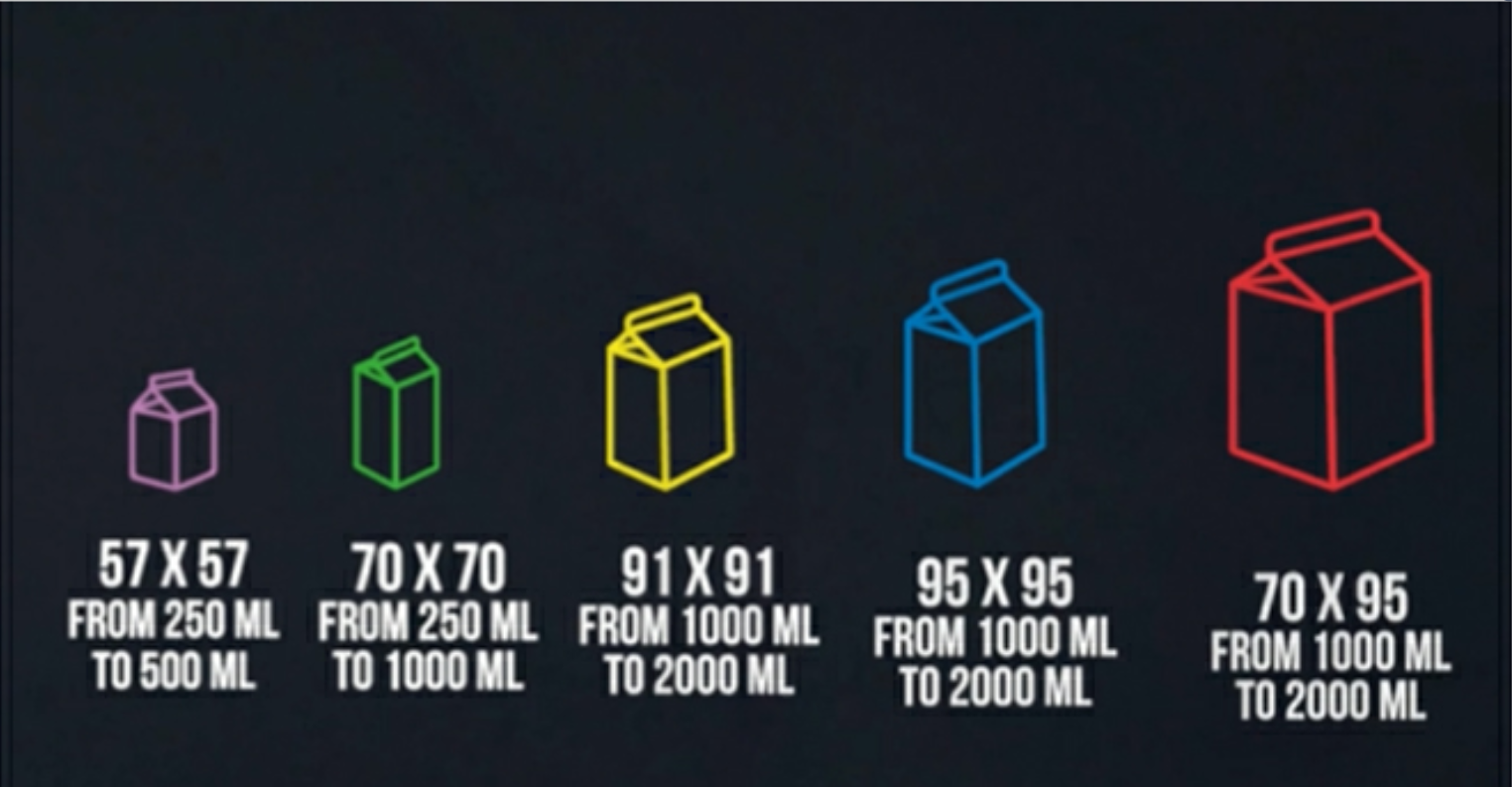 迷你型屋頂盒:底部尺寸57x57, 灌裝容量200,250,300,330,500ml