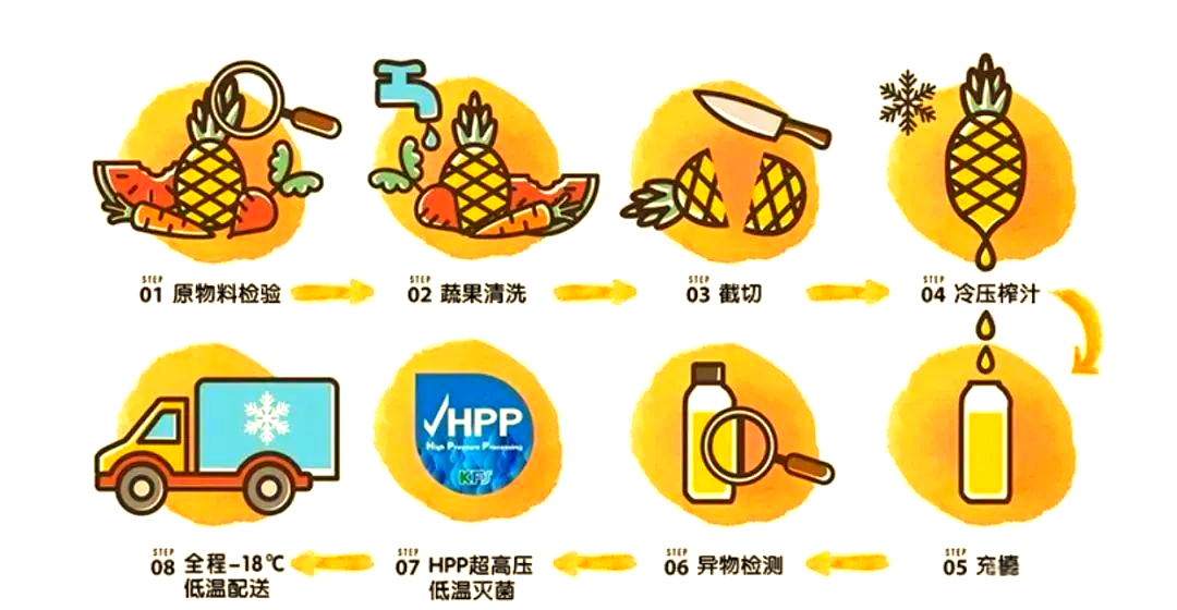 HPP即超高壓殺菌(High Pressure Processing),與NFC果汁相似,HPP果汁也是直接從新鮮水果中榨取。果汁被裝入瓶子,并送入高壓設(shè)備中,承受超過600兆帕的高壓處理。殺滅果汁中的有害細菌,同時確保營養(yǎng)成分和獨特風(fēng)味得到更高程度的保留。最后,經(jīng)過高壓處理的果汁通常在冷藏條件下儲存,以確保其保質(zhì)期的延長。